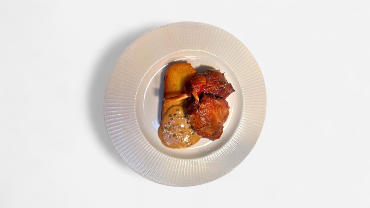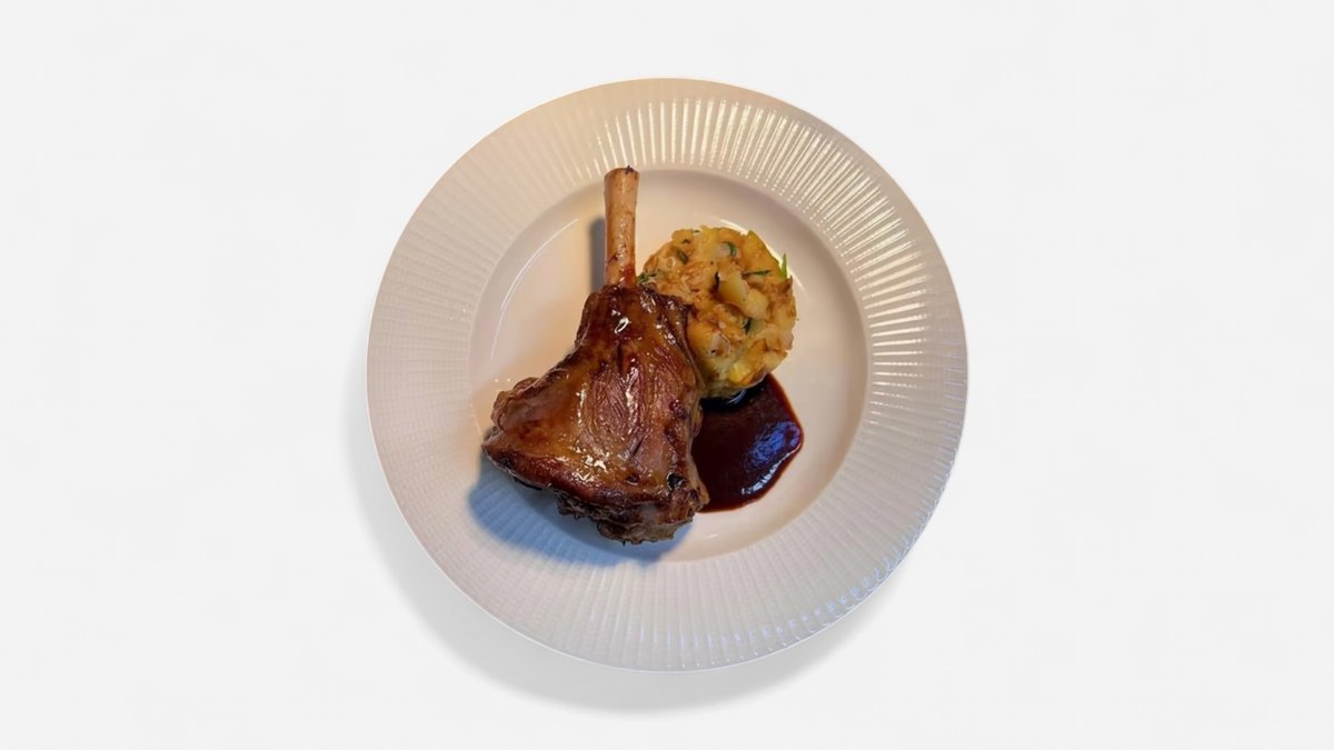 Ciolan de miel(260g) servit cu cartofi zdrobiți(120g) și sos de trufe albe cu unt (50g) 482g