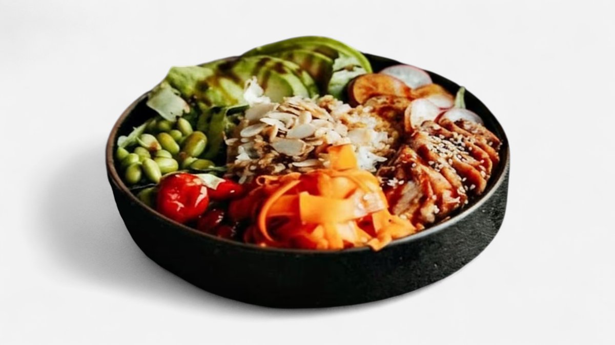 Ton(80g), edamame(30g), orez(80g), avocado 1/2, mix de salată(20g), peperoncini cu brânză(35g), ridiche roșie(15g), morcov(25g), fulgi de migdale, ulei de măsline . 350g
