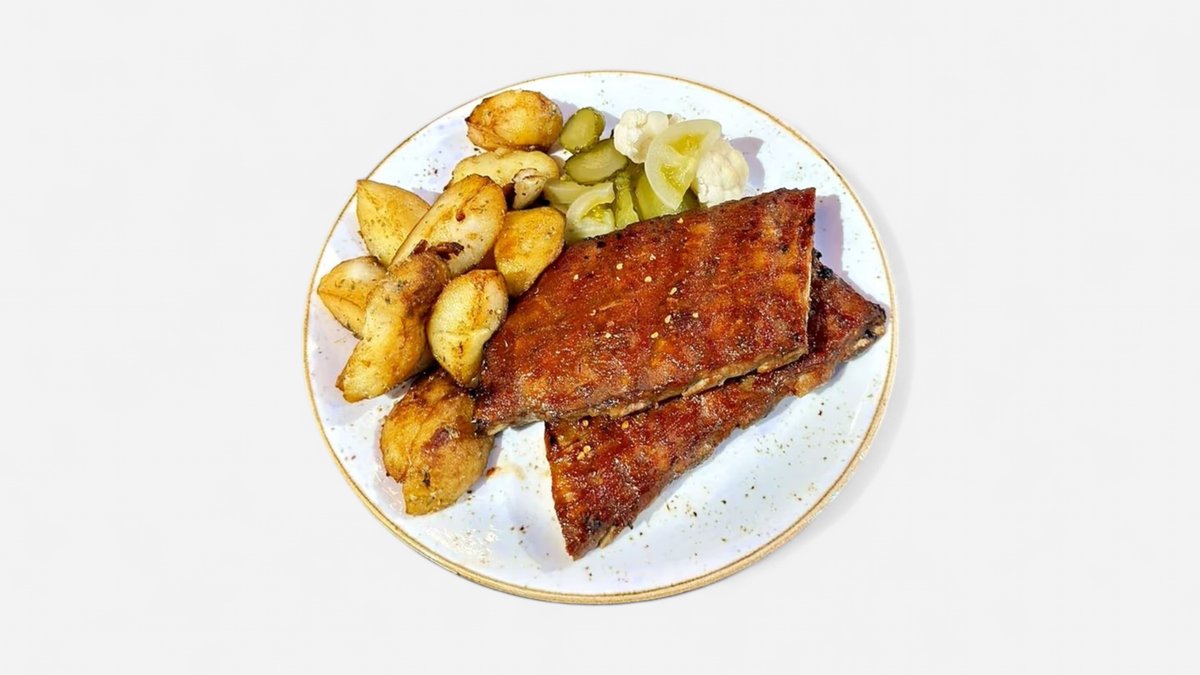 Burger din ceafă de vită(150g), cheddar(20g), sos bbq(10g), maioneză de casă(10g), ceapă deshidratată(2g), salată, chiflă burger(80g), castraveți murați, dulceață de ardei iute(10g), bacon(10g), cartofi dippers(170g), sos cocktail(50g) 510g