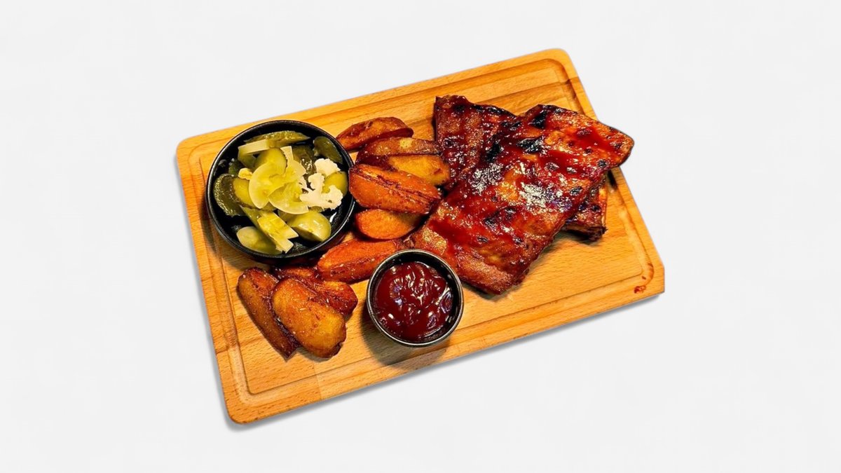 Burger din ceafă de vită (100 g), cheddar (20 g), sos BBQ (10 g), maioneză de casă (10 g), bacon (30 g), ceapă deshidratată (2 g), salată iceberg (40 g), chiflă burger (80 g), castraveți murați (20 g), cartofi dippers (170 g), sos de iaurt cu ceapă verde (50 g). Gramaj total: 500 g