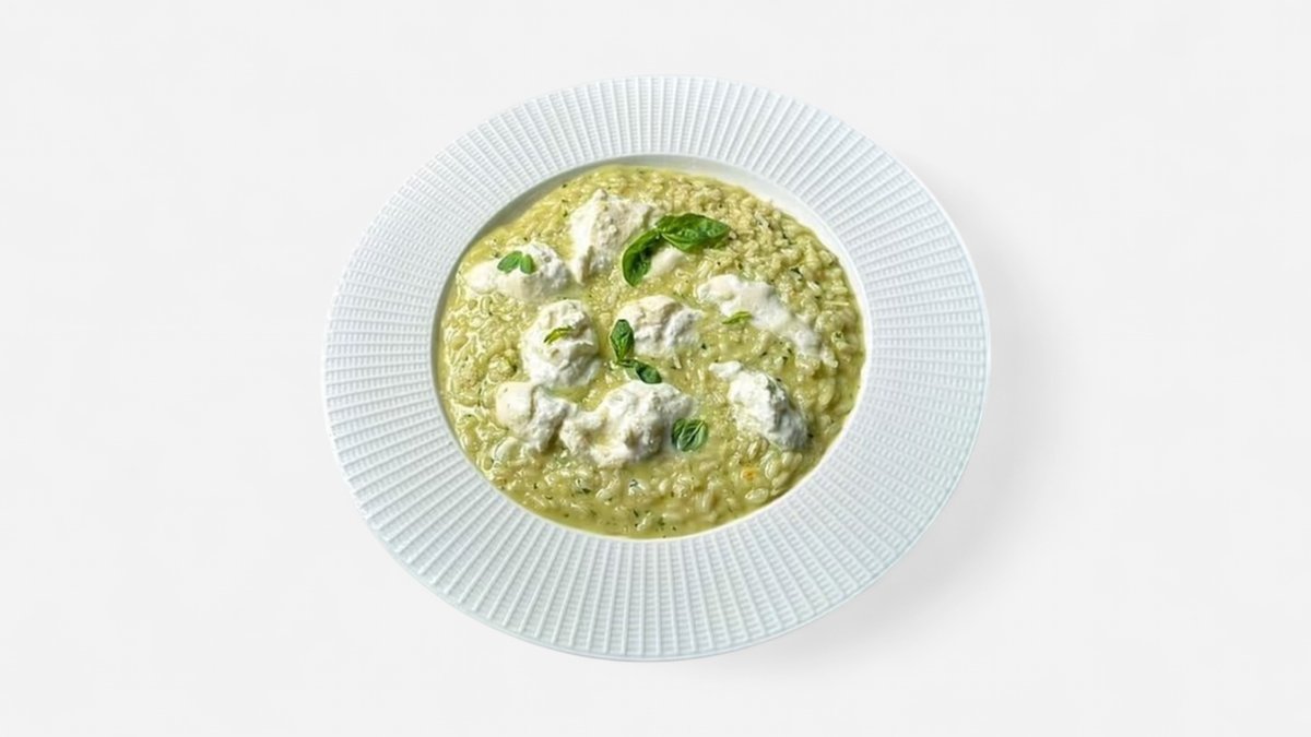 Orez arborio(120g), pesto(40g), buratta(125g), Parmigiano Reggiano*(Maturat35+luni)(30g), unt(10g) 325g