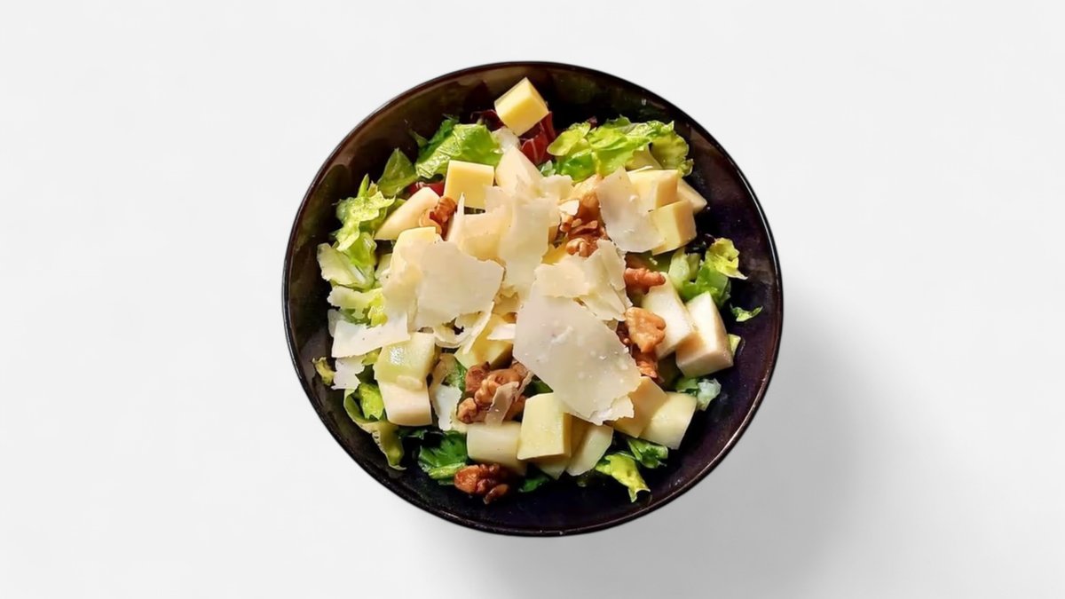 Mix de salată(100g), pere(50g), nuci(30g), parmezan(30g), cheddar(30g), vinaigrette dressing(40ml) 280g
