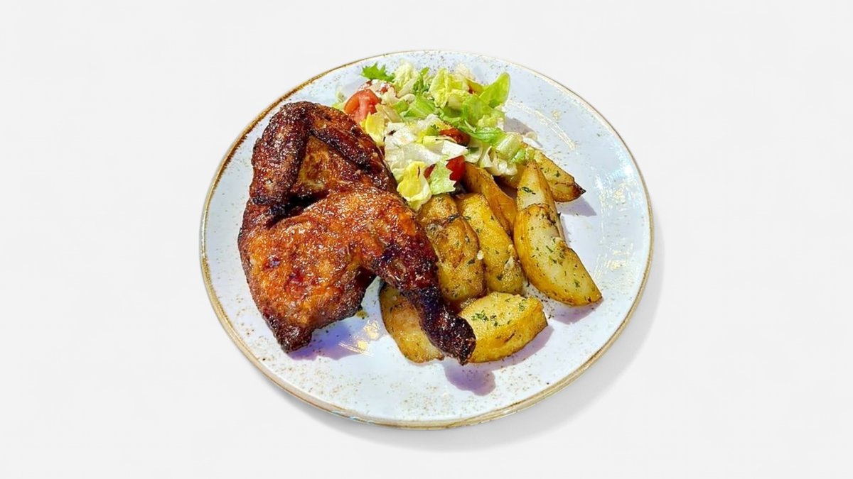 Jumătate de pui rotisat(480g), cartofi copți(120g), unt(40g), usturoi(10g), mix de salată(50g), roșii cherry(30g),vinaigrette dressing(40ml), sos sweet chill(50g) 820g.