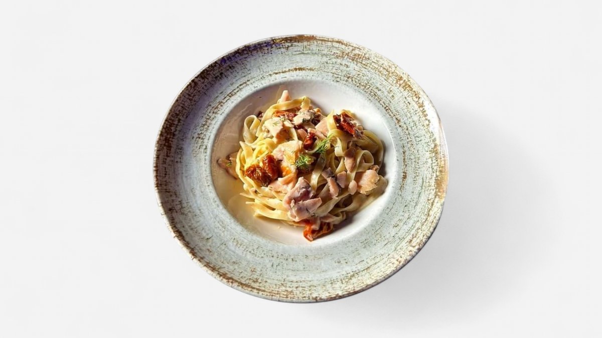 Paste(160g), somon afumat(70g), roșii deshidratate(20g), smântână de gătit(100g), mărar. 350g