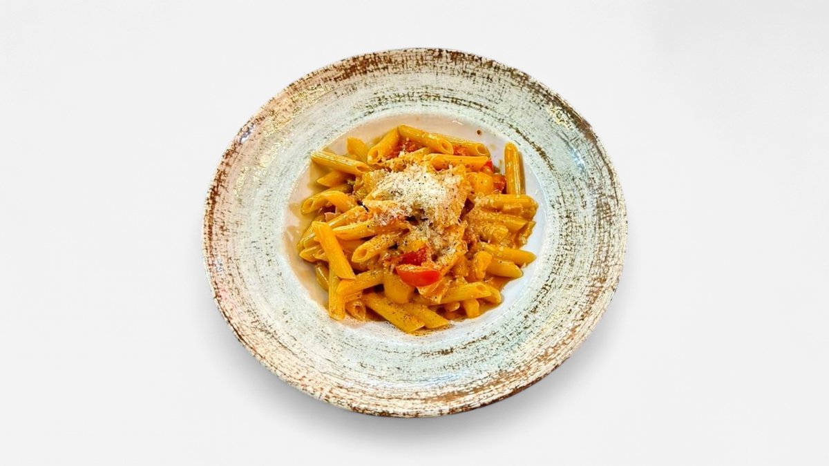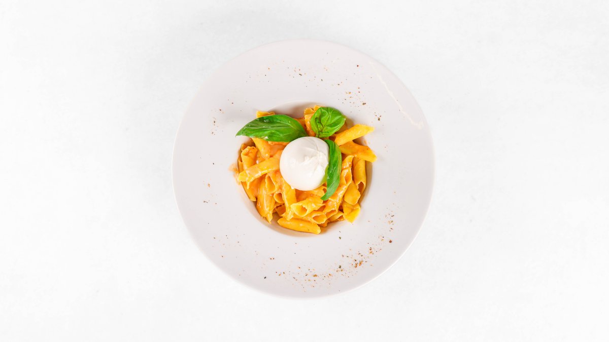 Penne(160g), sos de roșii San Marzano*(80g), busuioc, ulei de măsline, Parmigiano Reggiano*(Maturat+35luni)(20g), buratta(100g) 370g