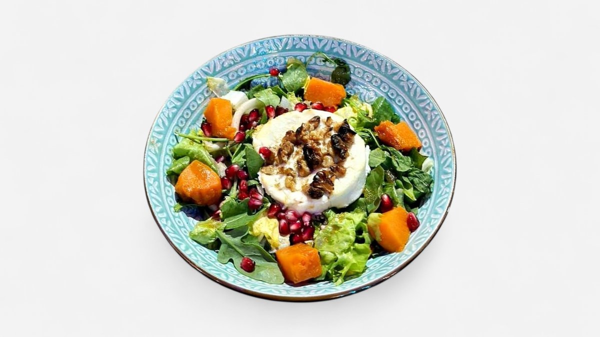 Mix de salată(30g), brânză de capră(100g), cartof dulce(120g), rucola(30g), nuci(30g), rodie(40g), vinaigrette dressing(40ml) 3300g