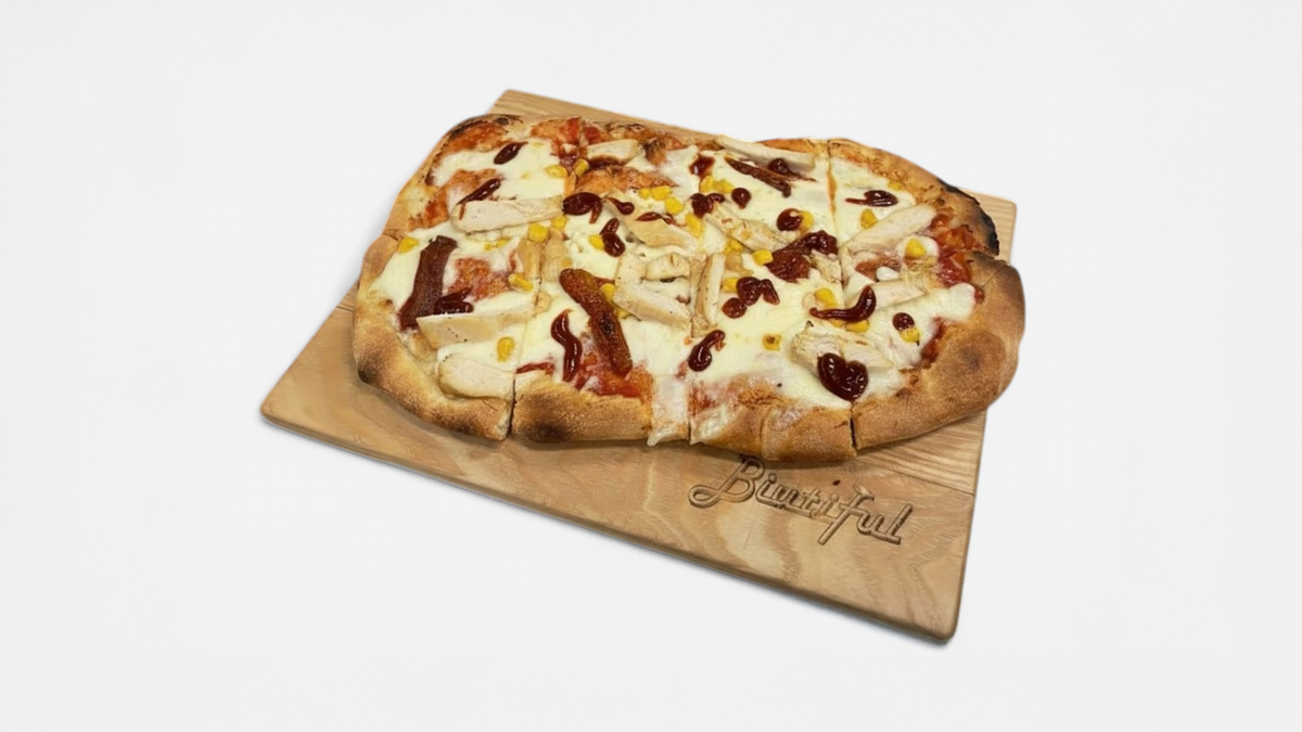 Blat pina(220g), sos de roșii San Marzano*(50g), mozarella fior di latte(100g), piept de pui(120g), porumb(30g), Parmigiano Reggiano*(Maturat +35 luni)(50g), sos bbq(30g), roșii deshidratate(20g) 650g