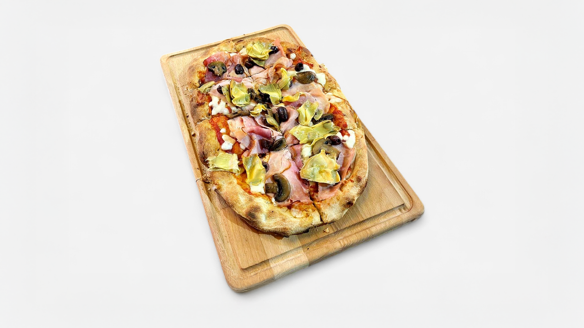 Blat pinsa(220g), sos de roșii San Marzano*(50g), mozarella fior di latte(100g), anghinare(30g), ciuperci(30g), prosciutto cotto(60g), măsline(30g), Parmigiano Reggiano*(Maturat+35 luni)(20g) 650g