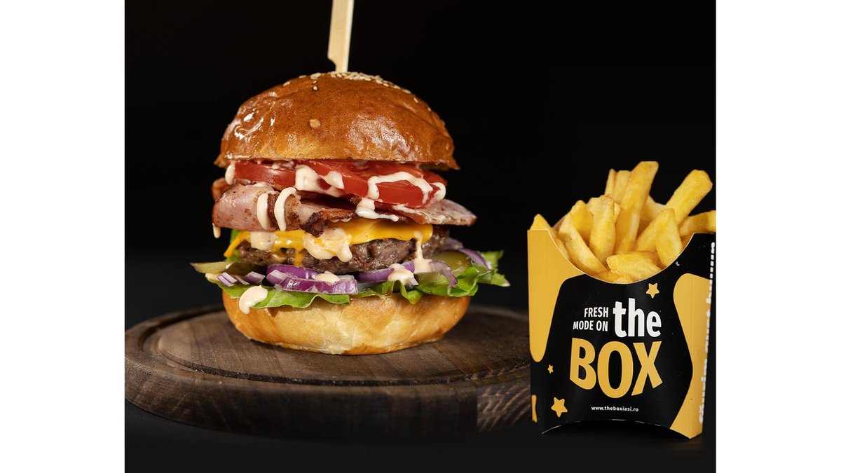 Carne de vita 200 G, Sos The BOX 30 G, Cartofi prajiti 100 G, Usturoi granulat 2 G, Rosii 50 G, Ceapa rosie 30 G, Lipie 1 Buc 70 G, Salata verde 20 G, Castraveti murati 30 G, Ulei 10 G, Sare 2 G, Piper negru macinat 2 G Beef 200 G, The BOX Sauce 30 G, French Fries 100 G, Granulated Garlic 2 G, Tomatoes 50 G, Red Onion 30 G, Flatbread 1 Piece 70 G, Lettuce 20 G, Pickles 30 G, Oil 10 G, Salt 2 G, Ground Black Pepper 2 G 480 G