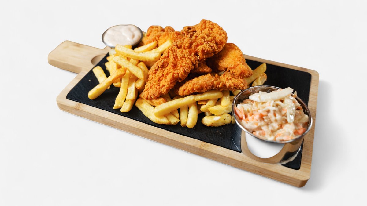 Vă propunem un meniu crispy delicios, cu bucăți fragede de pui în crustă crocantă, servite alături de cartofi prăjiți aurii, salată coleslaw proaspătă, roșii și un sos cremos 1000 insule – combinația perfectă pentru un prânz sau o cină pe gustul tuturor. Ingrediente: Crispy de pui ( 280- 300 g - 3/4 BUC): file de pui (64%), făină de grâu, apă, amidon de grâu, ulei de rapiță, sare, amidon modificat de cartof, agenți de creștere (E450, E500), amidon de orez, făină de porumb, oregano uscat, amidon de cartof, arome (conțin lapte, ou), usturoi uscat, colorant (extract de boia), potențiator de aromă (E621), ceapă uscată, extracte de condimente. Poate conține urme de soia, țelină, muștar. Cartofi prăjiți (150 g), Salată coleslaw (100 g), Roșii (20 g), Sos 1000 insule (60 g). 600 G