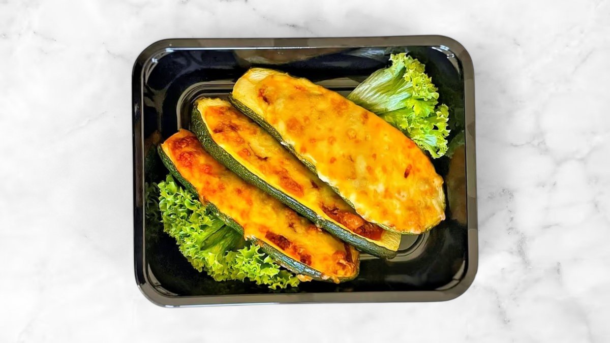 Zucchini umplut cu ragu de vita premium, gatit la cuptor cu sos de rosii si ierburi aromatice si presarat cu Cedar si Gouda. (380g)