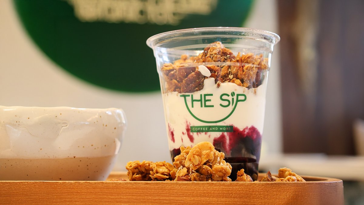 Granola (fulgi de ovăz, mix de nuci, fulgi de cocos, scorțișoară, ulei de cocos, sirop de agave), gem de fructe, iaurt grecesc, miere. Alergeni: cereale, fructe cu coajă lemnoasă, lapte 300g