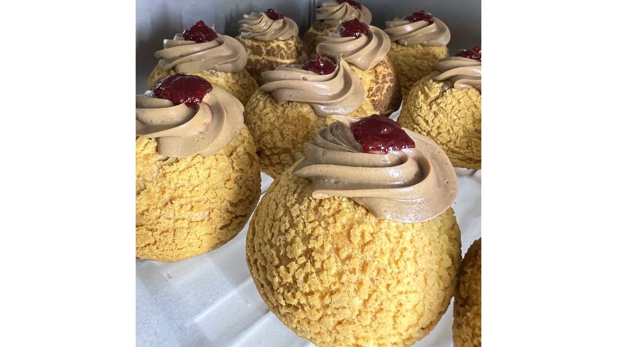 Aluat de choux, crema de ciocolata, insertieconfit zmeura