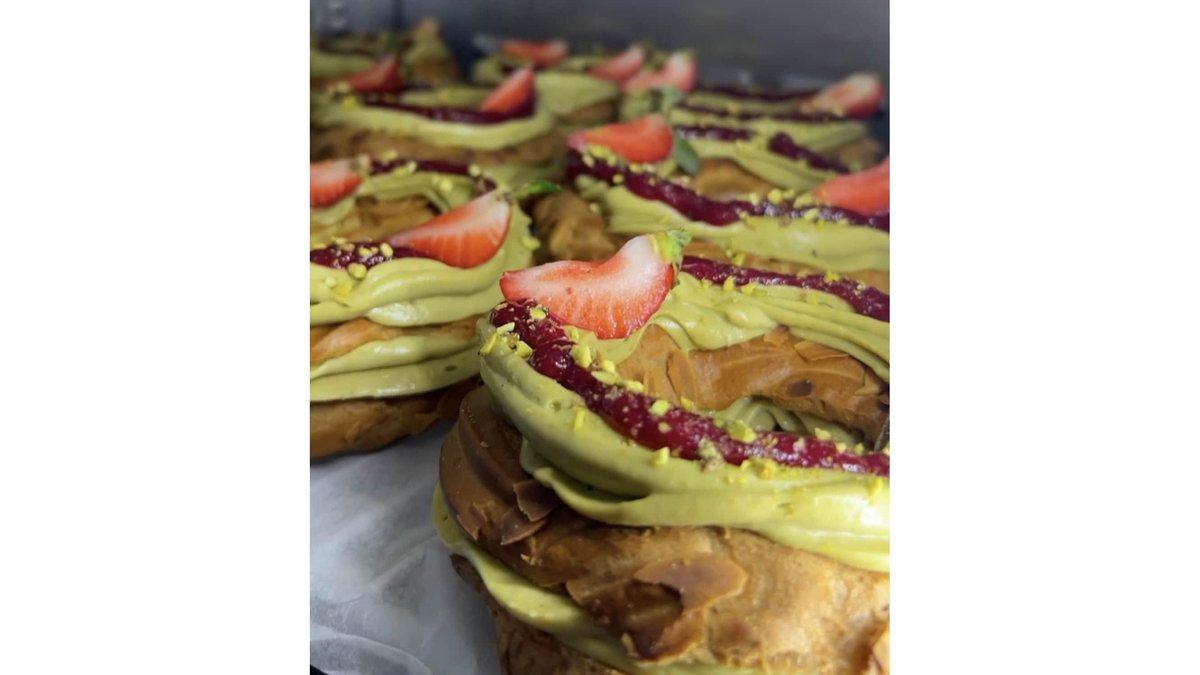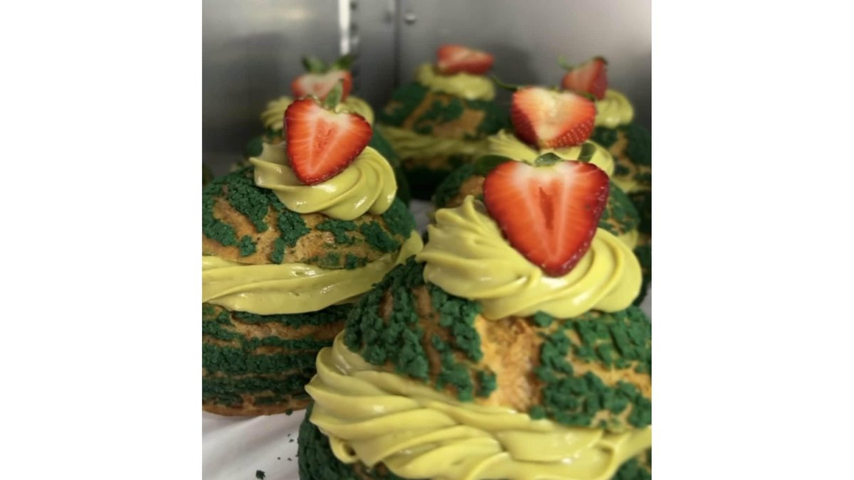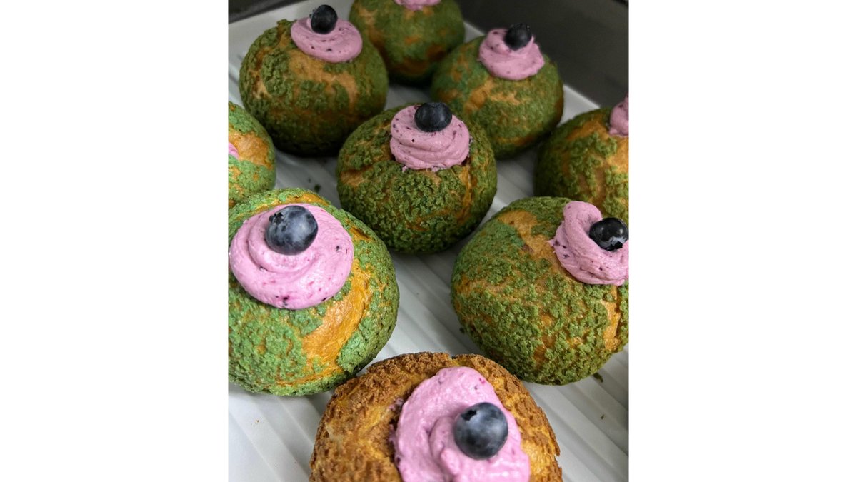 Aluat de ecler, inserție confit de zmeura, crema de fistic 100%.