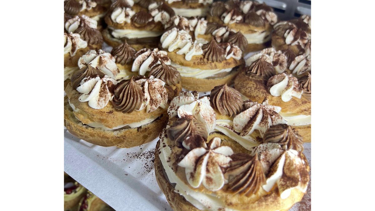 Aluat de choux, crema fina de mascarpone, frisca si ou gatit, insertie crema de ciocolata cu lapte si cafea.