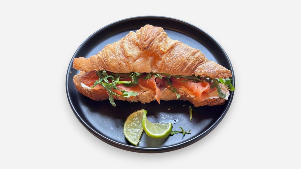Croissant cu somon, cremă de brânză și rucola – rafinament în fiecare mușcătură Un croissant proaspăt, fraged , umplut cu felii fine de somon afumat, cremă de brânză catifelată și un mix fresh de salată. Fiecare ingredient este ales cu grijă pentru a crea un echilibru perfect între gust, textură și prospețime. Un sandwich elegant, sățios și surprinzător de lejer — ideal pentru micul dejun, prânz sau o pauză gourmet în orice moment al zilei.