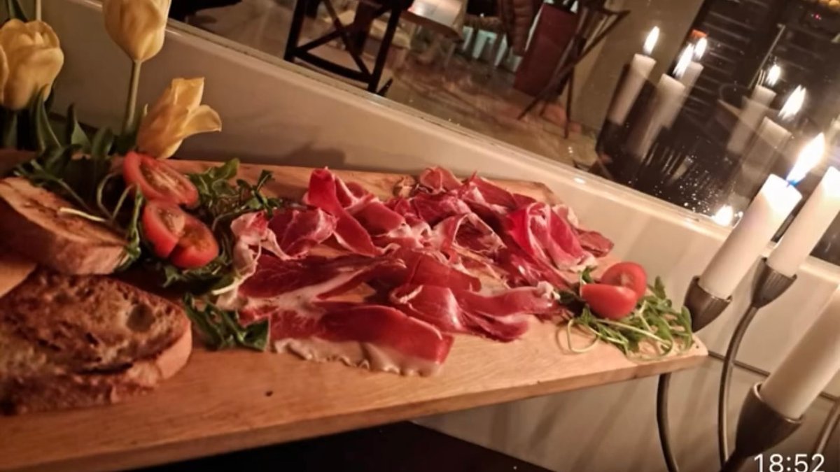 100 gr sunca crud uscata de mangalita ,de Spania servita cu paine prajita aromatizata cu usturoi si rosii cherry