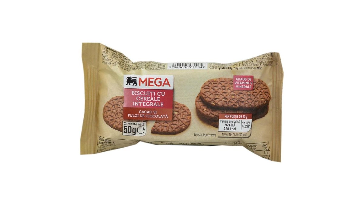 MEGA Biscuiti cu cereale integrale, cacao si fulgi de ciocolata 50g