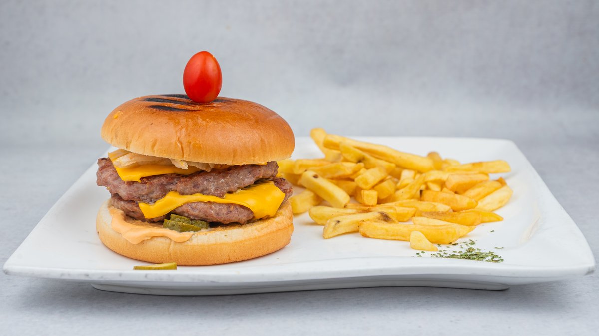 burger sa čedar sirom burger sosom kiselim krastavcicima i čerijem prilog pomfrit.