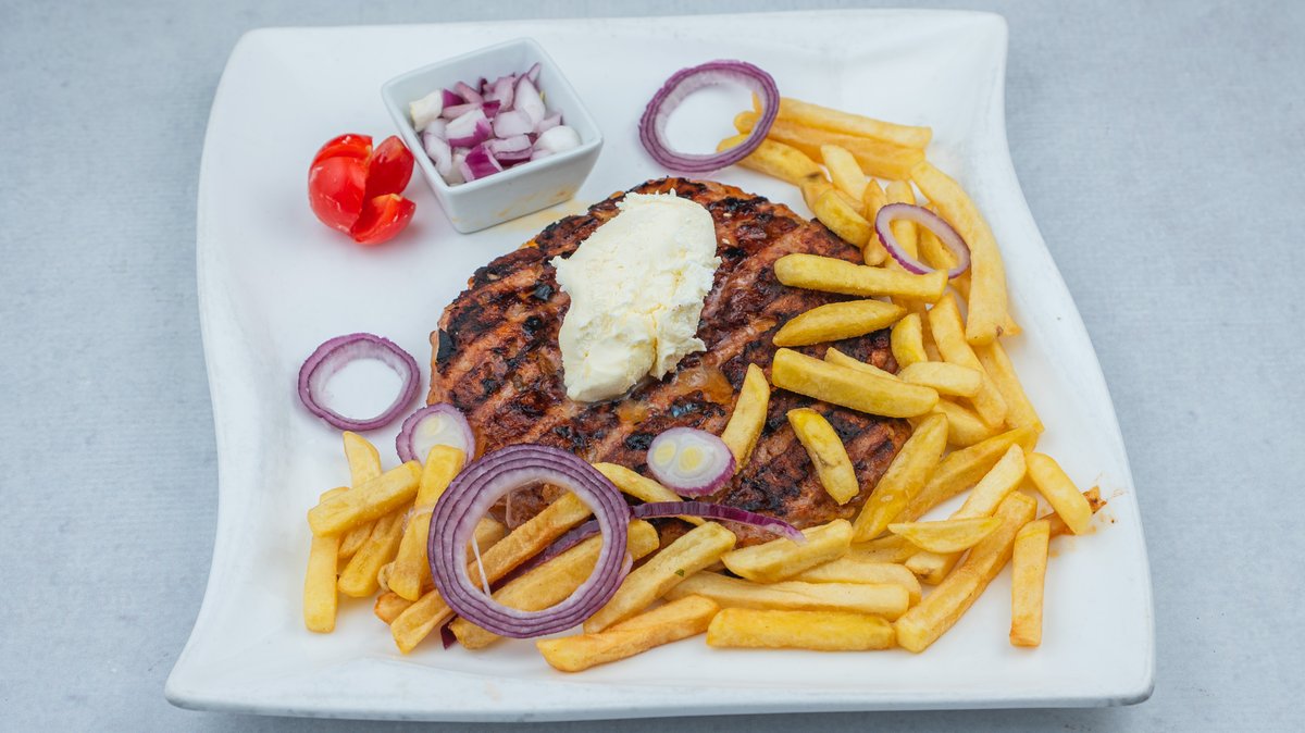 Pljeskavica Aloha domaca sa mladim kajmakom prilog pomfrit i crveni luk moze biti ljuta i neljuta