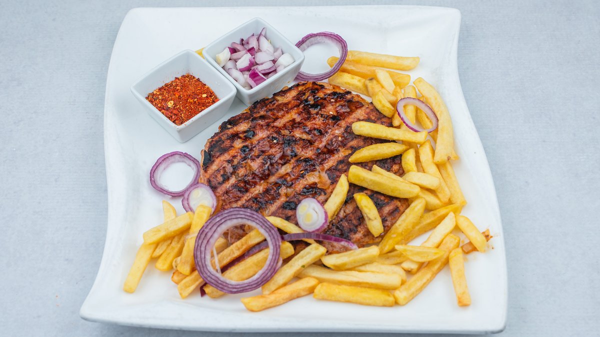 Pljeskavica "Aloha" domaca 300gr prilog pomfrit i luk moze biti ljuta i neljuta