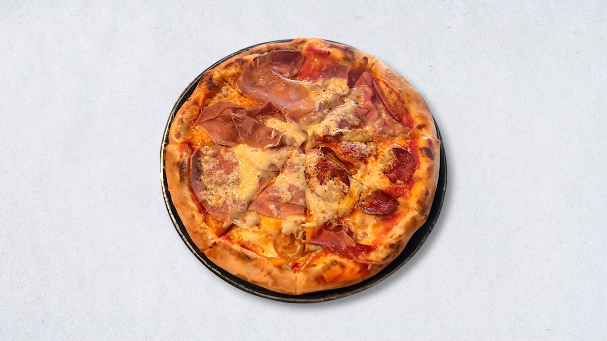 4 Amiga Pizza 32cm - Sveža Quattro Stagioni pizza sa ukusnim sastojcima: pelat, mocarela, šunka, pršuta, i kulen.