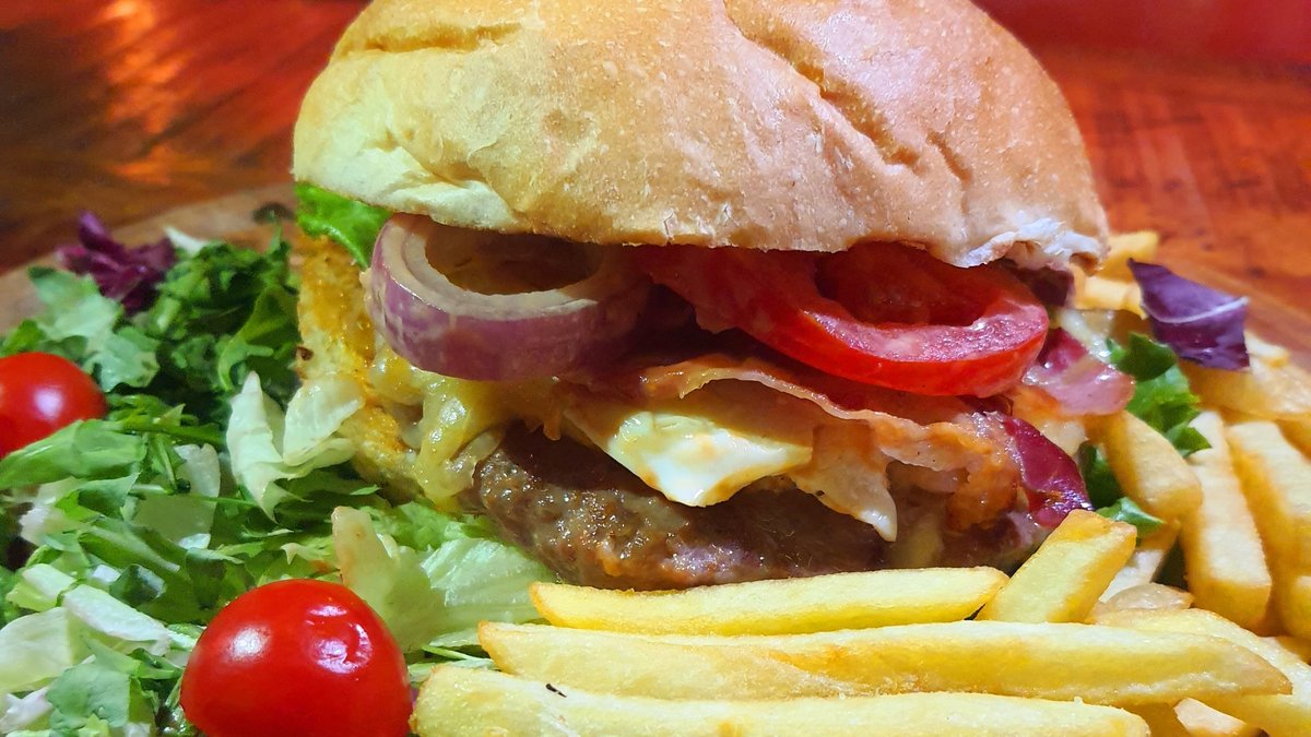Pljeskavica,burger sos,topljeni kačkavalj,hrskava slaninica,jaje,paradajz,crveni luk, iceberg salata