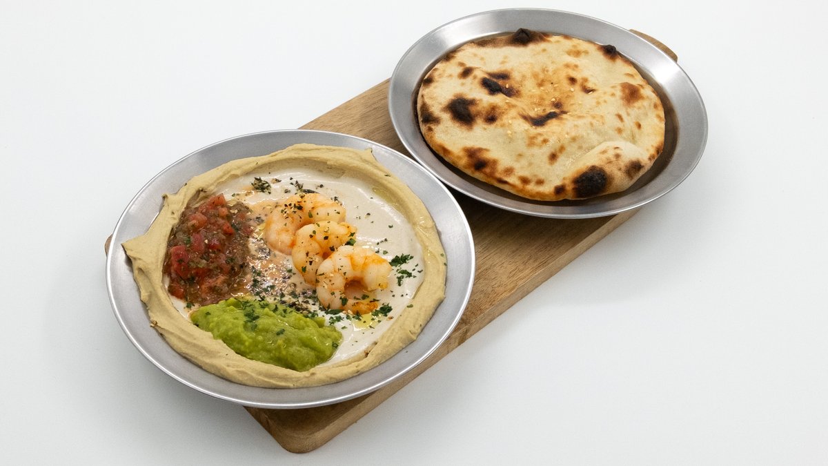 Kremasti humus sa tahinij jogurtom, paradajz salsom, domaćim guakamolom i prženim škampima. Služi se sa maslinovim uljem, zaatarom i peršunom. Služi se sa toplim lepinjama.