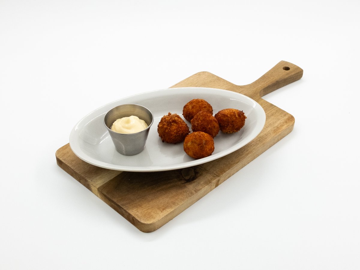 Hrskavi kroketi sa nežnim bešamel filom i šunkom. Služi se sa ajoli sosom od belog luka, limunovog soka i maslinovog ulja.