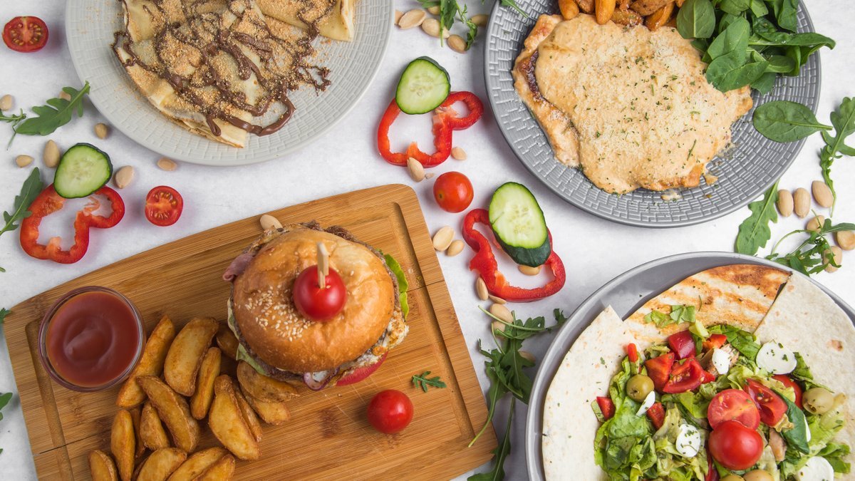 juneće meso, jaje, paradajz, sos, čeri paradajz, slanina, crveni luk, začini, senf sos, pomfrit