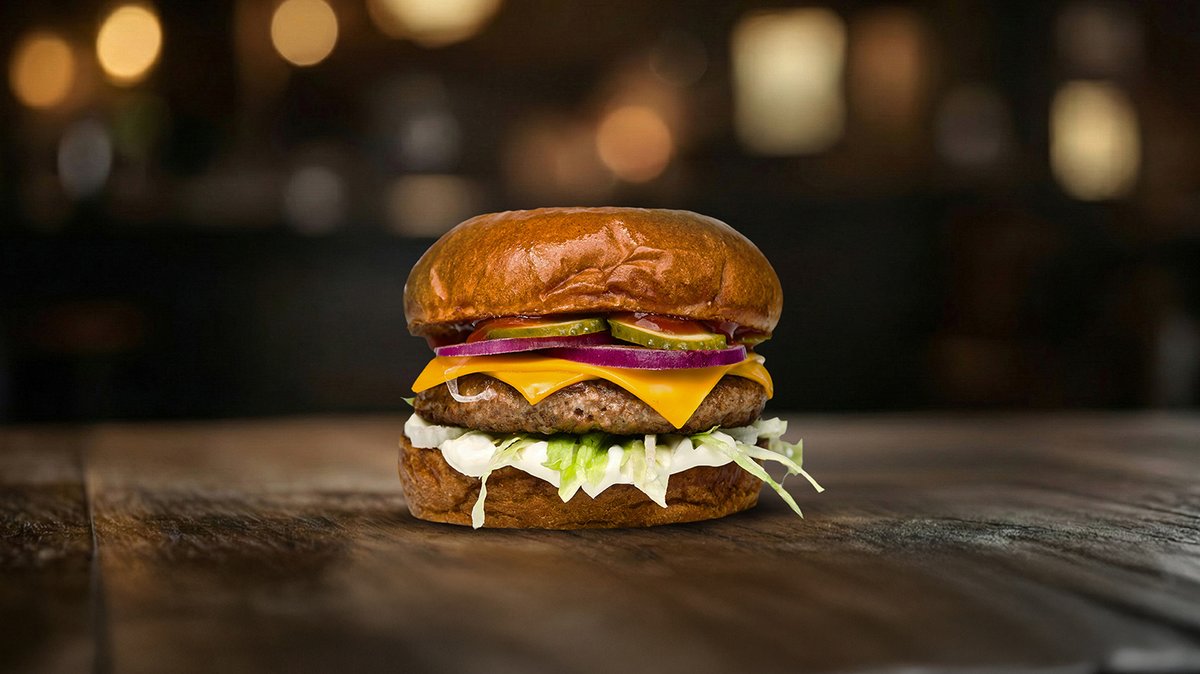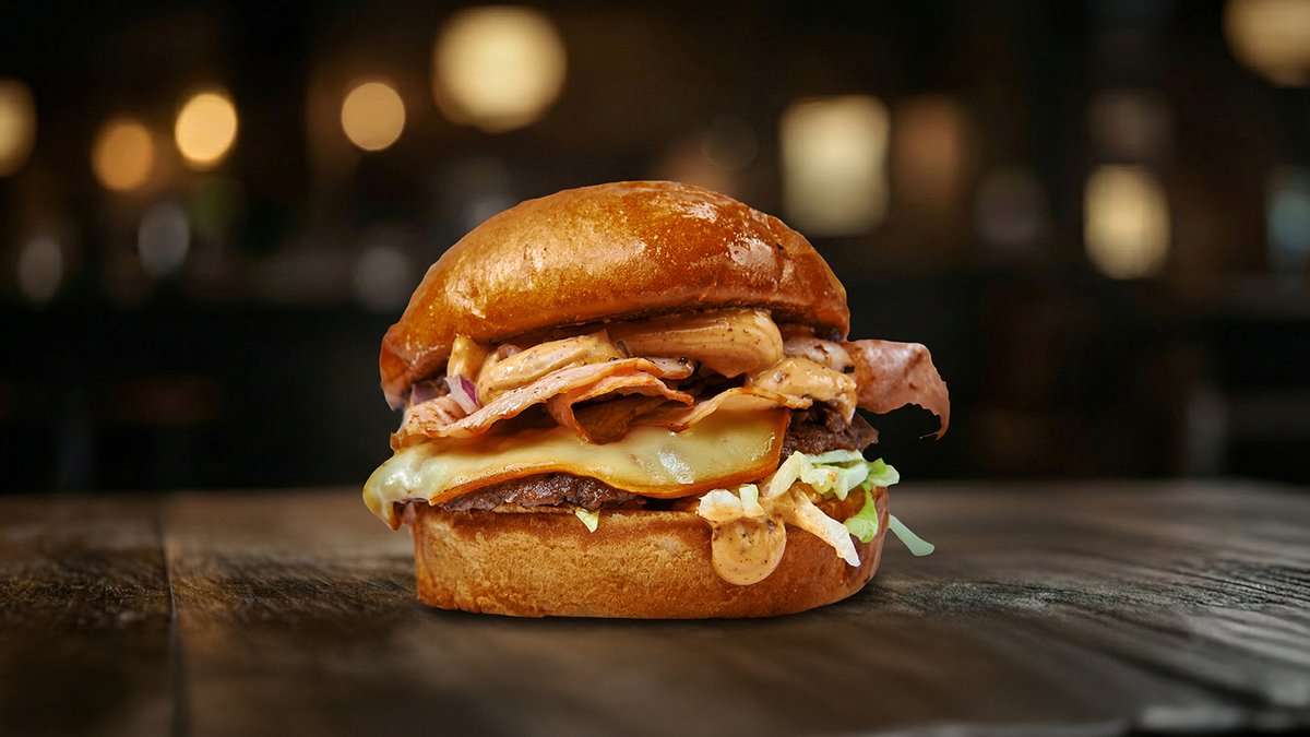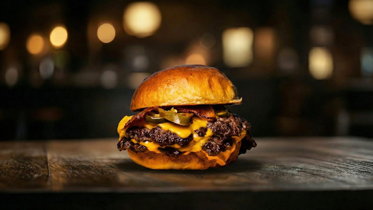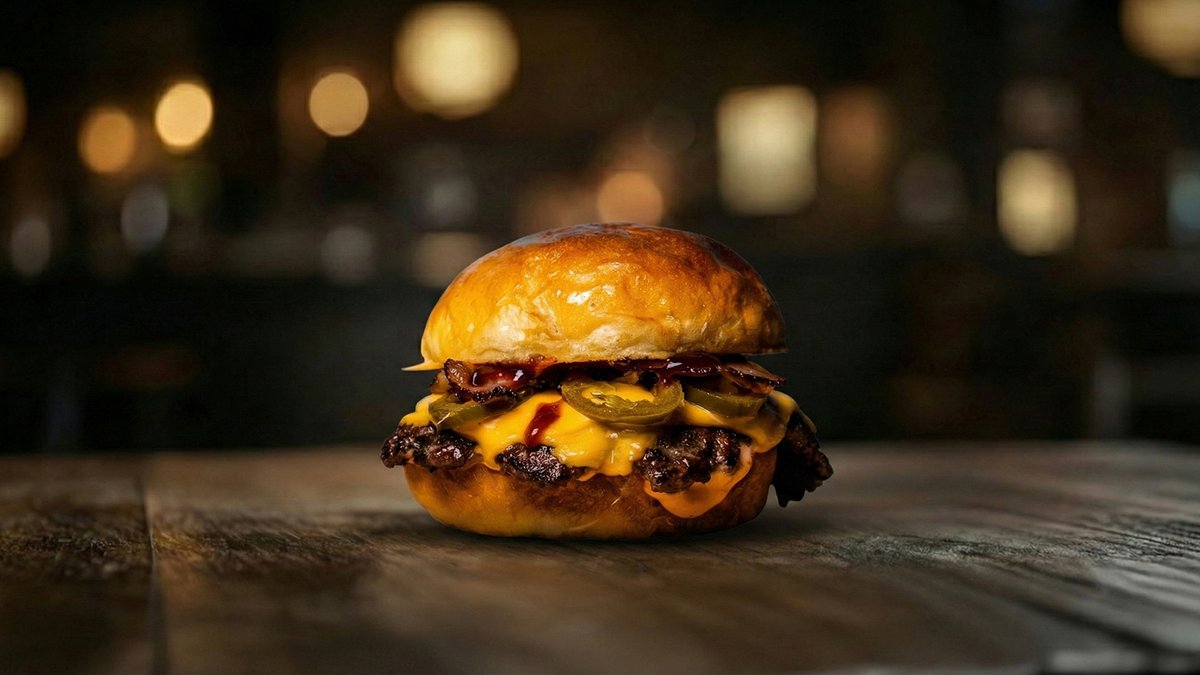 brioche pecivo, 100% junetina, cheddar, karamelizovani luk, bacon mayo, hrskavi luk, jalapeno