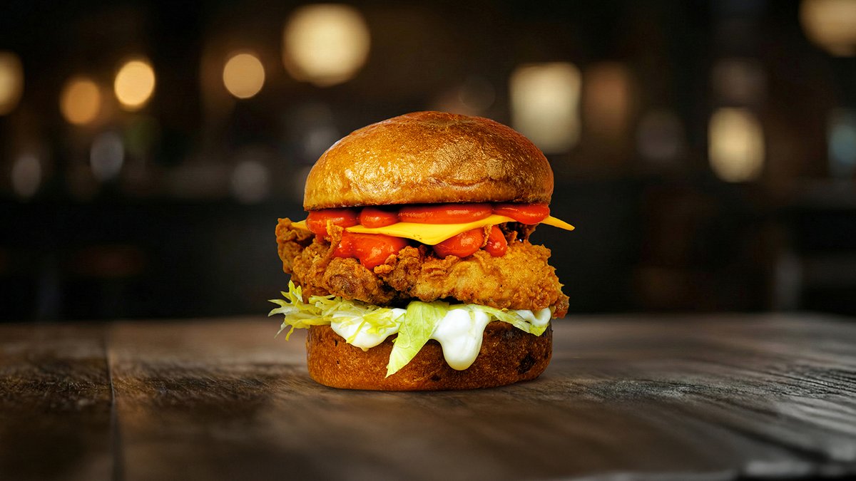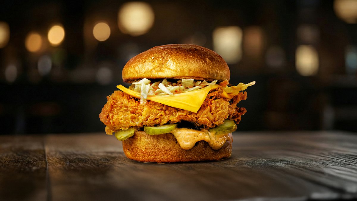 Brioche pecivo, big smash sos, crispy piletina, cheddar, koleslav salata, kiseli krastavčići
