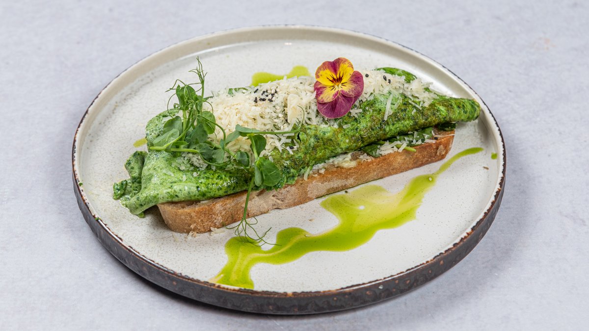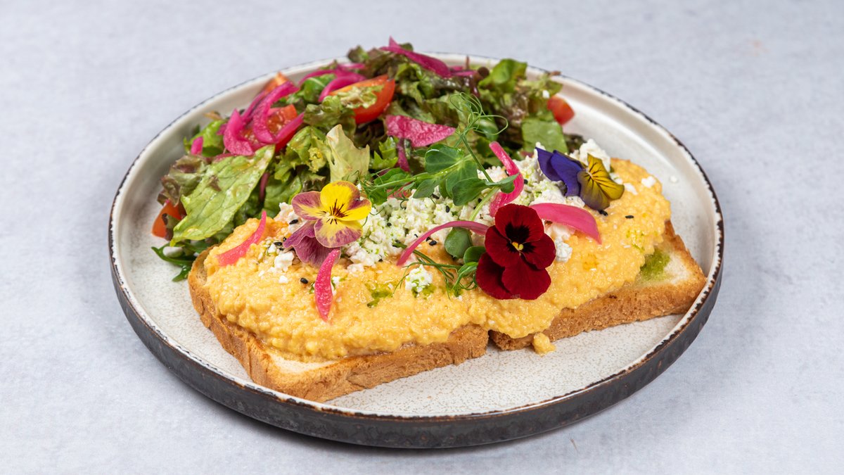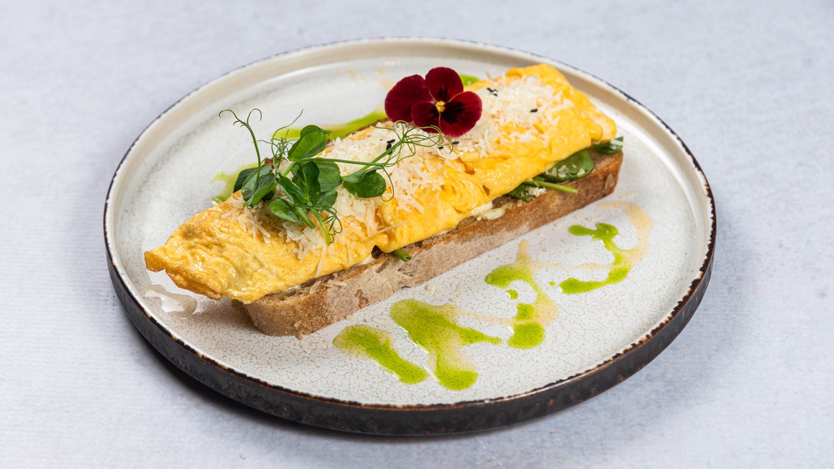 P:40g | M:31g | Uh:39g | 595kCal | Brioš hleb, jaja, puter, koziji sir, miks salata, senf-med dressing