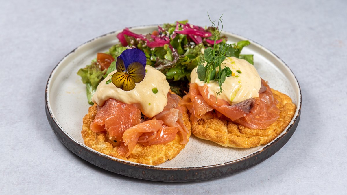 P:51g | M:52g | Uh:10g | 712 kCal | Zemičke od jaja, ajoli, spanać, poširana jaja, dimljeni losos, holandez, salata, honey dressing