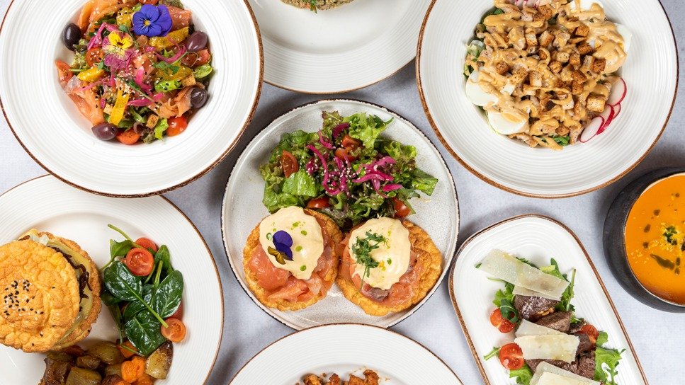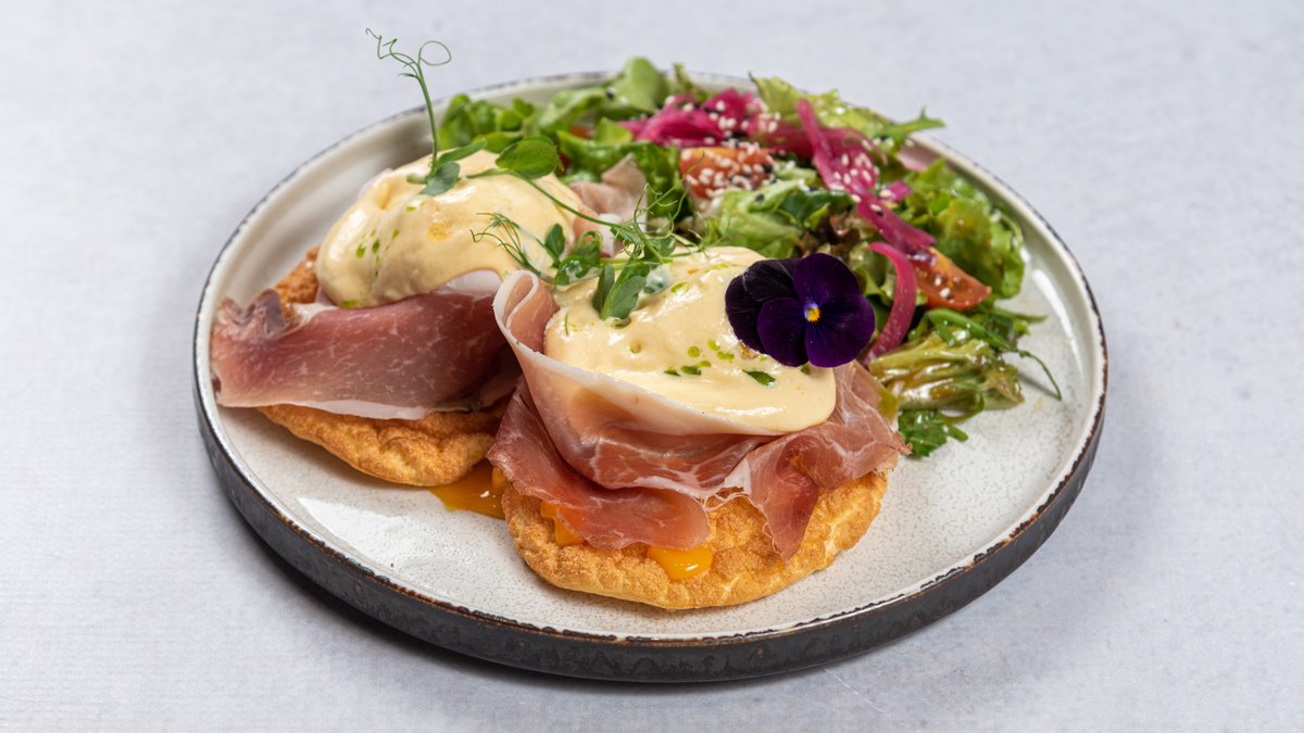P:51g | M:49g | Uh:10g | 685 kCal | Zemičke od jaja, ajoli, spanać, poširana jaja, pršuta, holandez, salata, honey dressing