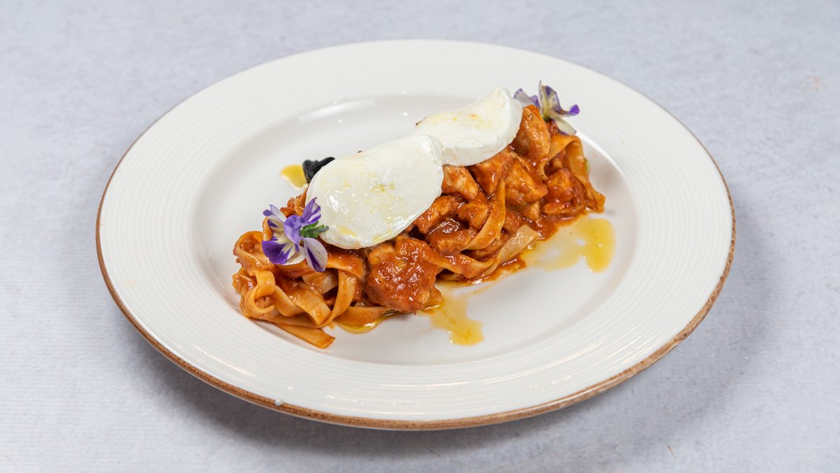 P:72g | M:23g | Uh:72g | 783 kCal | Pileći file 200g, sveža mocarela, puter, parmezan, napolitan sos, taljatele