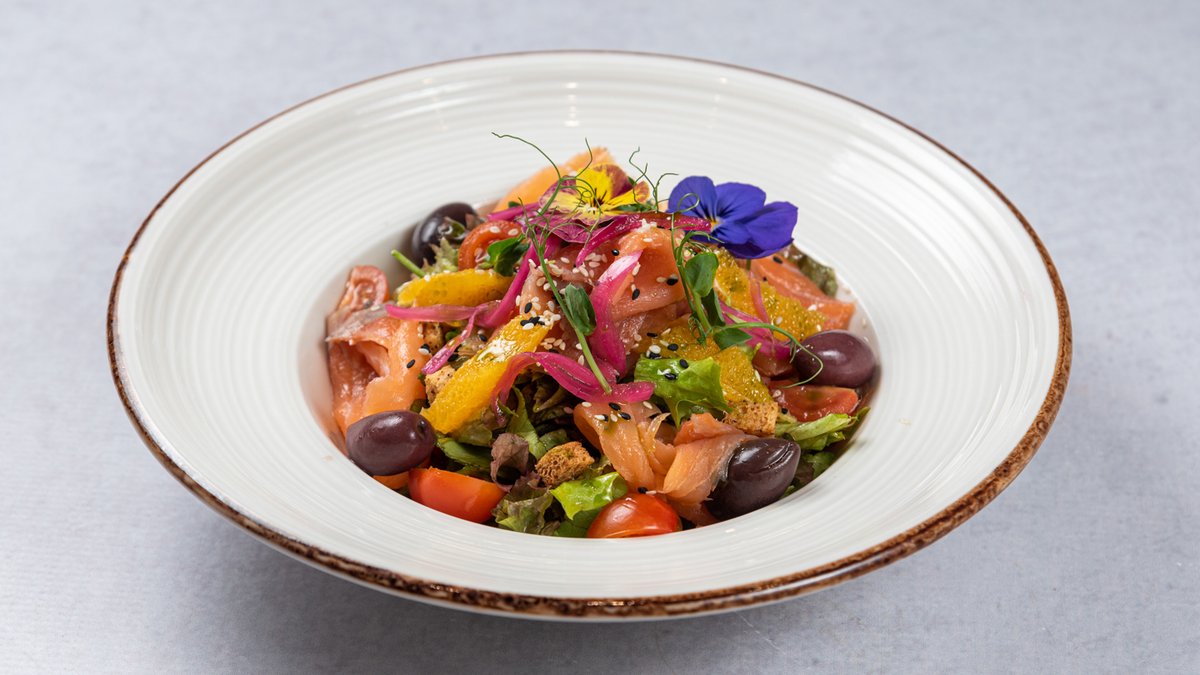 P:17g | M:36g | Uh:18g | 464 kCal | Dimljeni Losos, miks zelenih salata, paradajz, kiseli luk, pomorandža