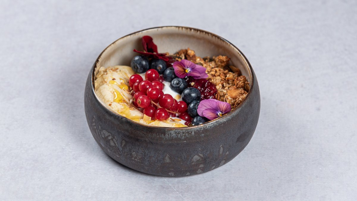 P:16g | M:33g | Uh:67g | 629kCal | Granola, grčki Jogurt, sos od crvene ribizle, sveže voće, banana