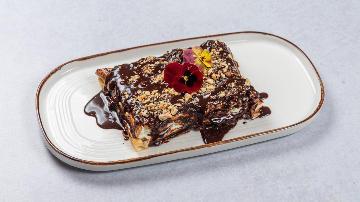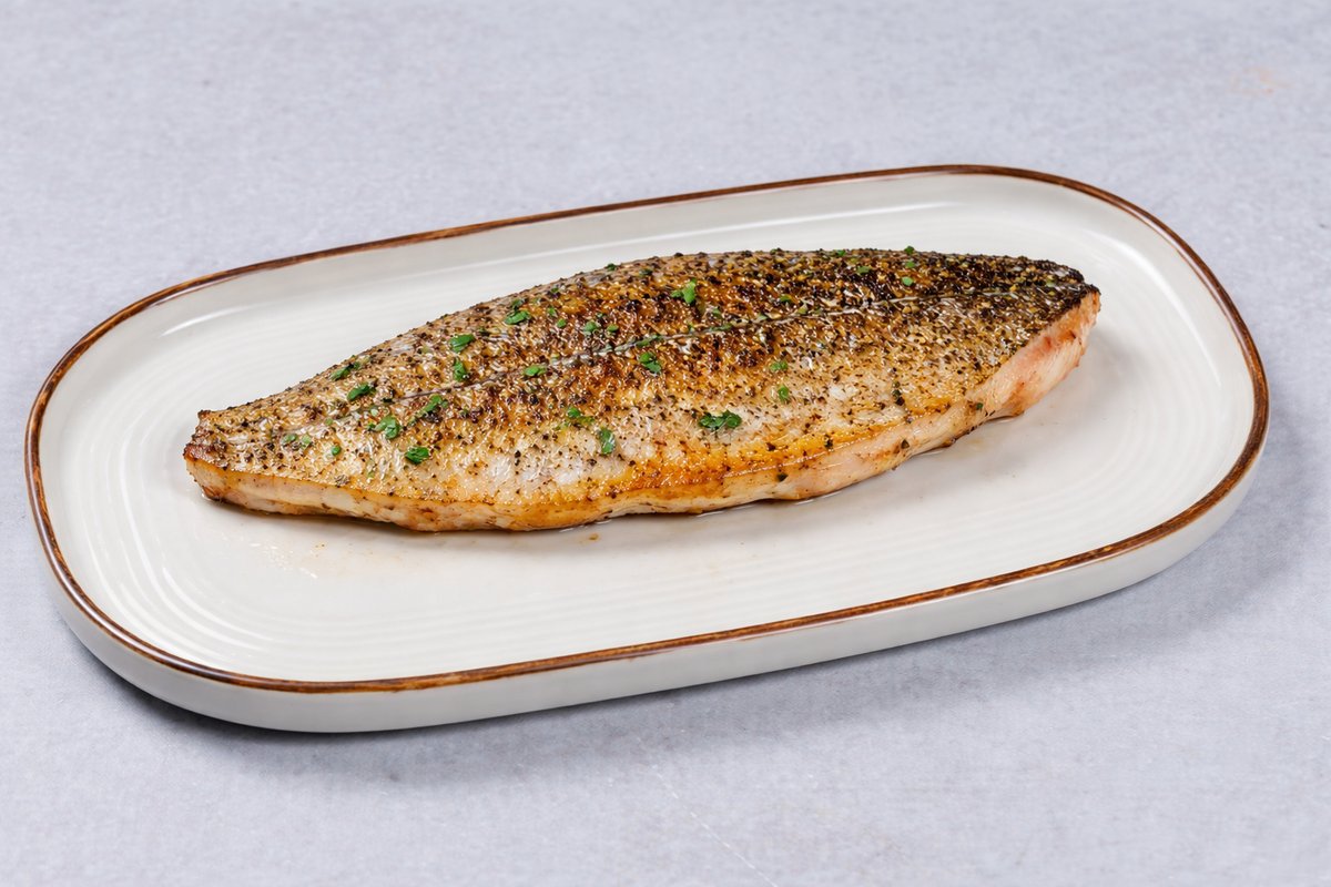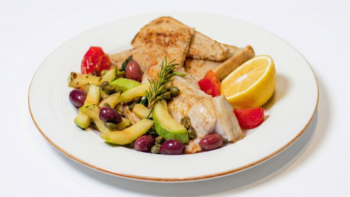 Dimljeni fileti pastrmke, tikvica, čeri, masline, kapar, bosiljak, ruzmarin, maslinovo ulje, limun, hleb od kiselog testa