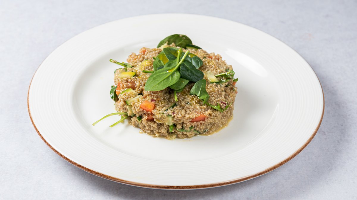 P:10g | M:5g | Uh:63g | 337 kCal | Kinoa, krastavac, paradajz, baby spanać, senf-med dresing