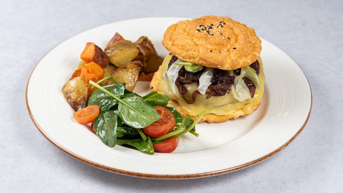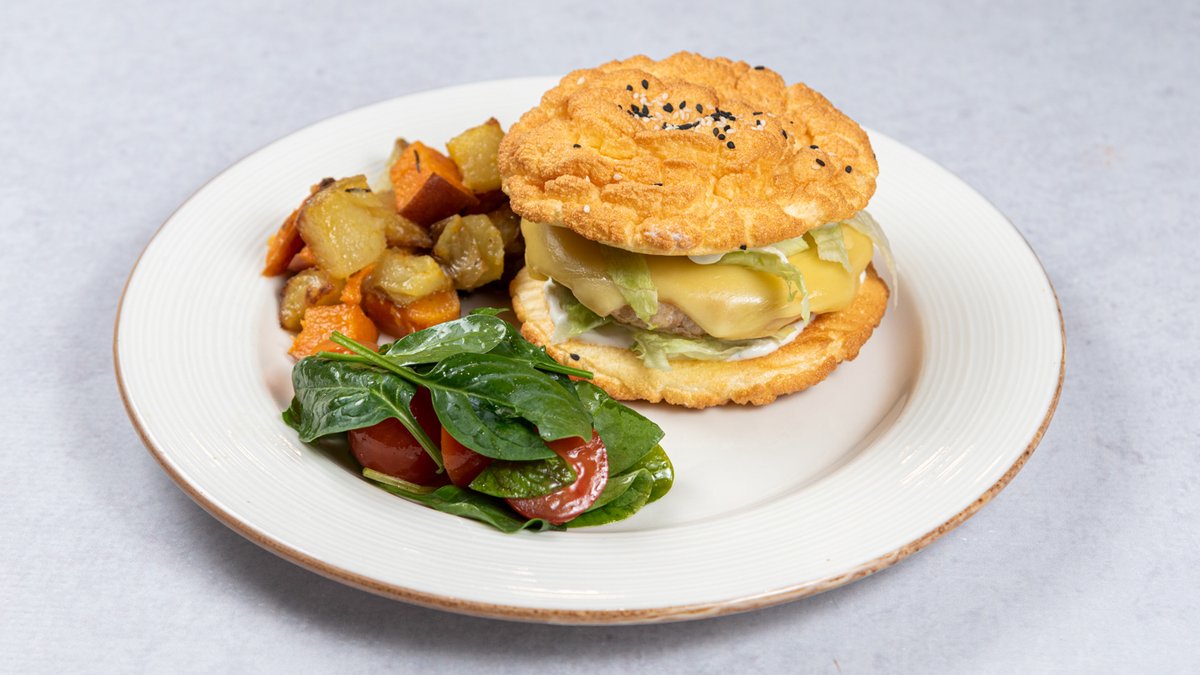 P:77g | M:29g | Uh:45g | 752 kCal | Juneći but 200g, jaja, ella sir, senf-med, iceberg, mozzarela, luk, batat, krompir, spanać