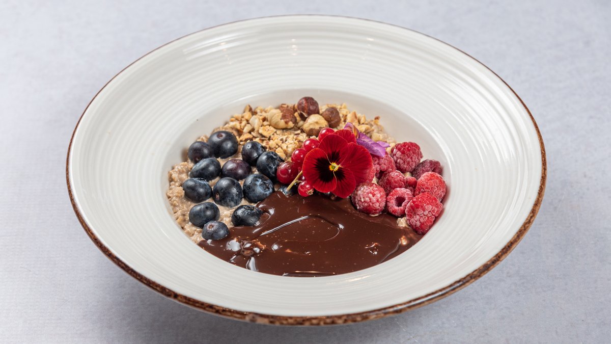 Ovsene pahuljice, protein vanila, banana, crna čokolada, lešnik, malina