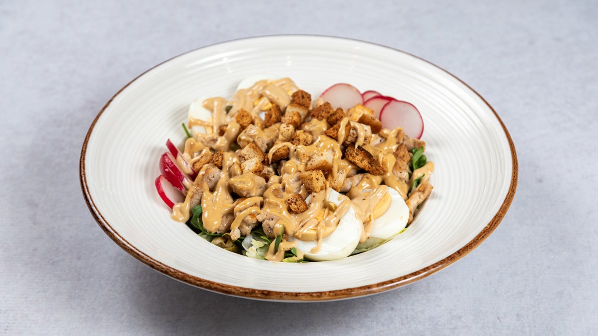 P:63g | M:34g | Uh:15g | 618 kCal | Pileći file 200g, 2 jaja, rotkvica, kapar, iceberg, čeri, rukola, krutoni, dresing