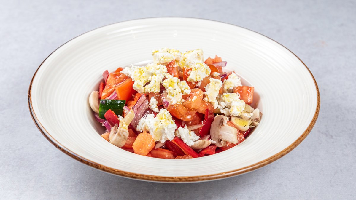 P:12g | M:40g | Uh:14g | 464 kCal | Paradajz, krastavac, paprika, crveni luk, šampinjoni, thyme dressing, feta sir