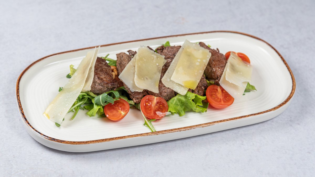 P:44g | M:34g | Uh:3g | 494 kCal | Biftek 150g, parmezan, pinjoli, čeri, lolo bjonda, rukola, thyme dresing
