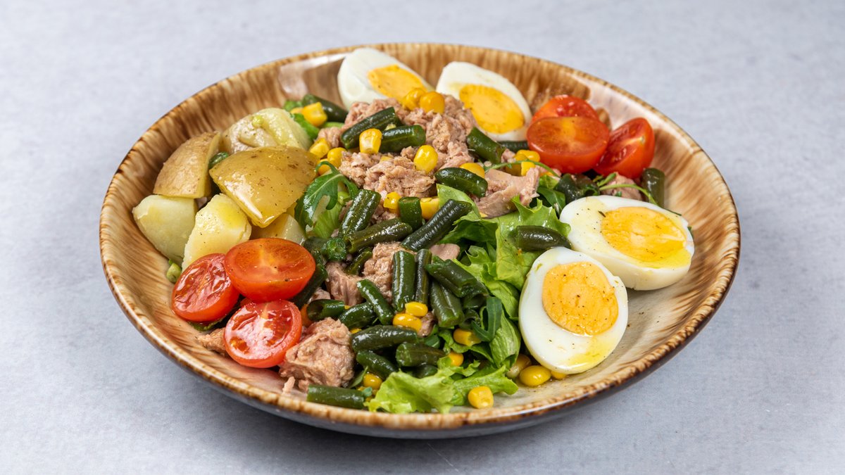P:45g | M:34g | Uh:20g | 566 kCal | Tunjevina 120g, 2 jaja, boranija, čeri, rukola, lolo bjonda, krompir, kukuruz, thyme dresing