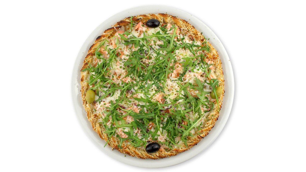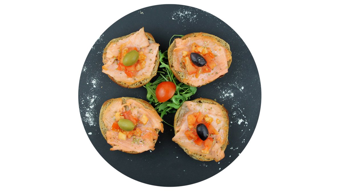 Maslinovo ulje, sir, dimljeni losos, rukola, paradajz, crveni luk