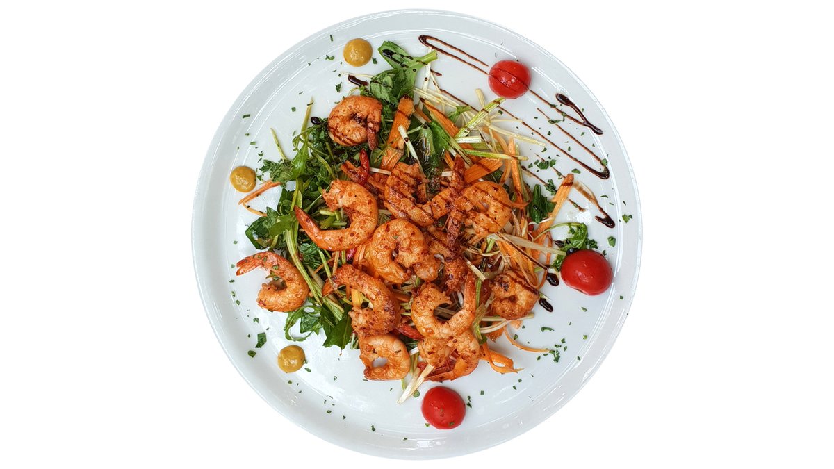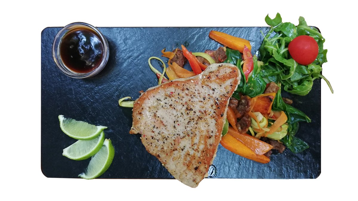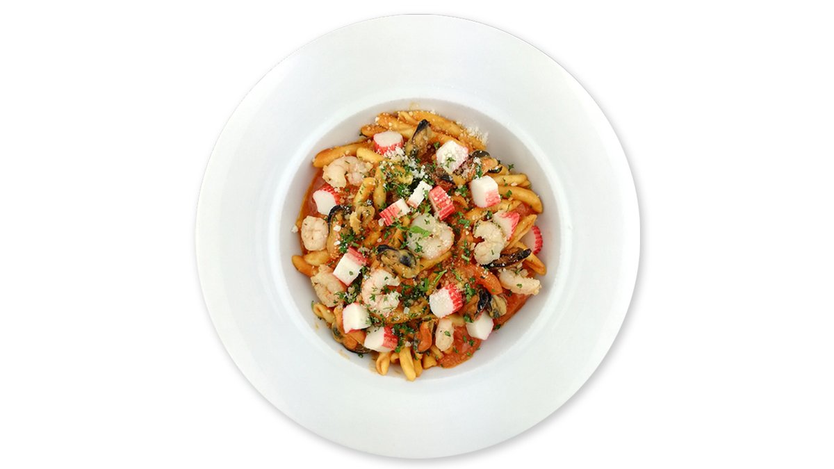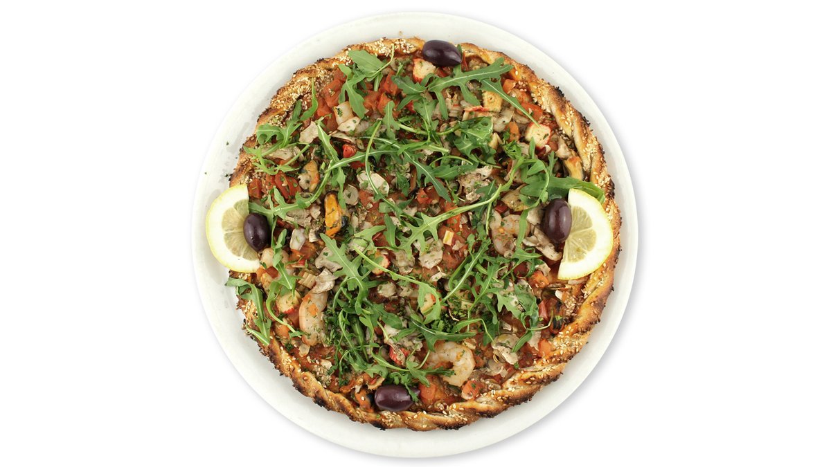 Pelat, šampinjoni, morski plodovi, limun, maslinovo ulje, masline, beli luk, rukola, paradajz