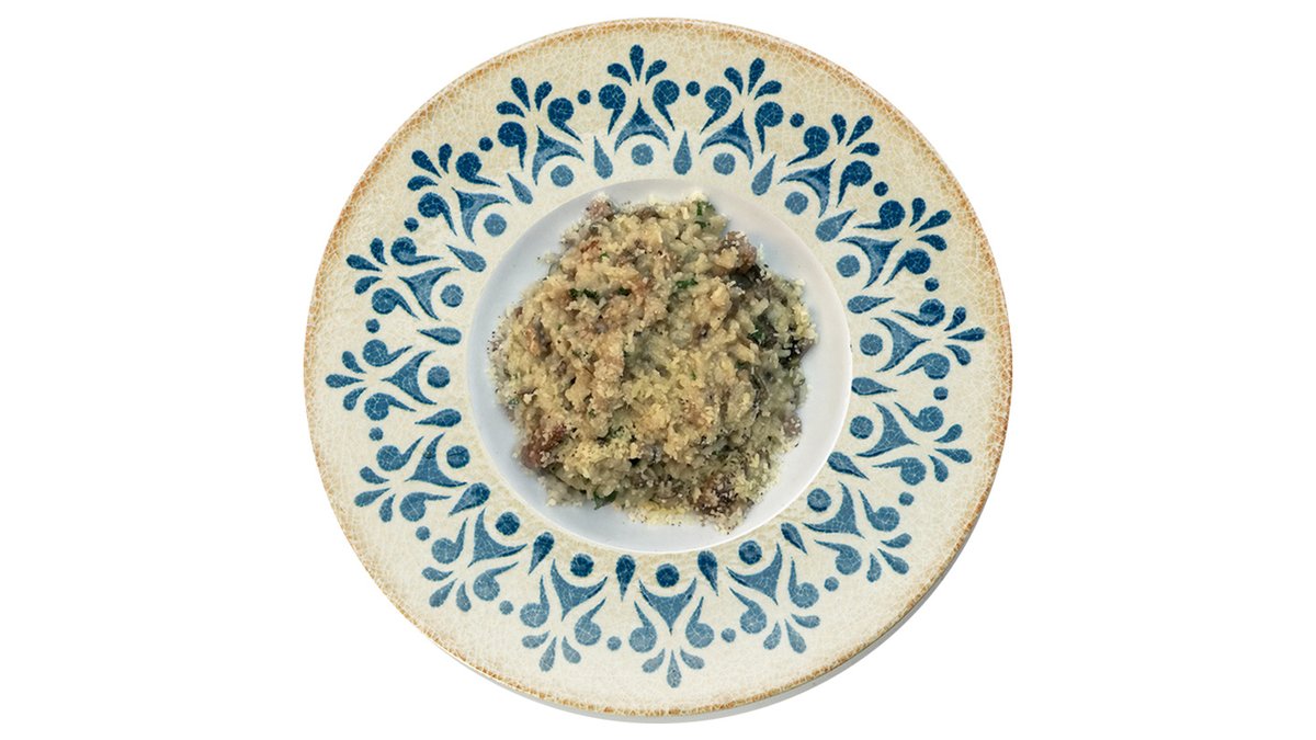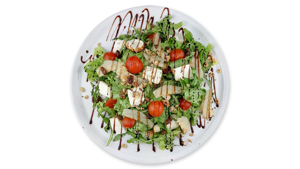 Rukola, zelenih salata, čeri, kruška, krutoni, orah, suvo grožđe u konjaku i medu, redukovani aceto