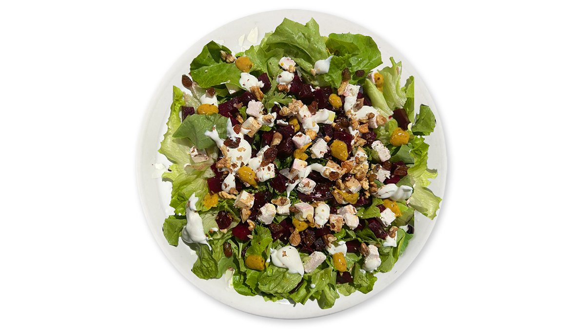 Kozji sir, rukola, beli dresing, orah, senf dižon, grožđice
